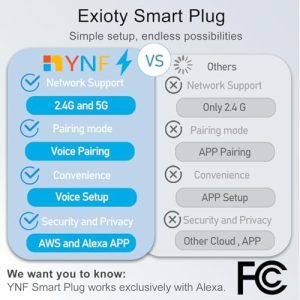 **ExIoTy Smart Plug (4 Pack) – Your Voice-Activated Home Assistant** Transform your home into a smart home with the ExIoTy Smart Plug! Designed for seamless integration with Alexa, this innovative plug allows you to control your devices effortlessly with just your voice. Experience the convenience of a simple setup that requires only one voice command to get started. **Key Features:** – **Voice Control:** Compatible with Alexa, the ExIoTy Smart Plug lets you turn your devices on and off using just your voice. No more fumbling for switches or remotes – just ask Alexa, and you’re all set! – **Remote Control:** Manage your appliances from anywhere using the companion app on your smartphone. Whether you’re at work or on vacation, you can keep your home running smoothly with a few taps on your screen. – **Timer & Schedule:** Set up timers and schedules to automate your home. Program your lights to turn on at sunset or your coffee maker to brew at a specific time – the possibilities are endless! – **Group Controller:** Create groups for multiple smart plugs, allowing you to control several devices simultaneously. Perfect for coordinating all your smart gadgets with a single command. – **BLE Mesh Connectivity:** The ExIoTy Smart Plug connects to your Alexa Echo device via BLE Mesh technology, ensuring a stable and reliable connection throughout your home. **Why Choose ExIoTy Smart Plug?** – **Easy Setup:** Get started in minutes with a straightforward installation process. – **Energy Efficiency:** Monitor your energy usage and reduce waste, making your home smarter and greener. – **Compact Design:** The sleek, space-saving design fits any outlet without blocking adjacent sockets. With the ExIoTy Smart Plug (4 Pack), you’ll elevate your home’s functionality while enjoying the ease of voice control. Whether it’s managing your lights, appliances, or other devices, the ExIoTy Smart Plug is your perfect partner for a smarter, more connected home. **Upgrade your lifestyle today!** Order your ExIoTy Smart Plug (4 Pack) and start experiencing the convenience of a voice-activated home.